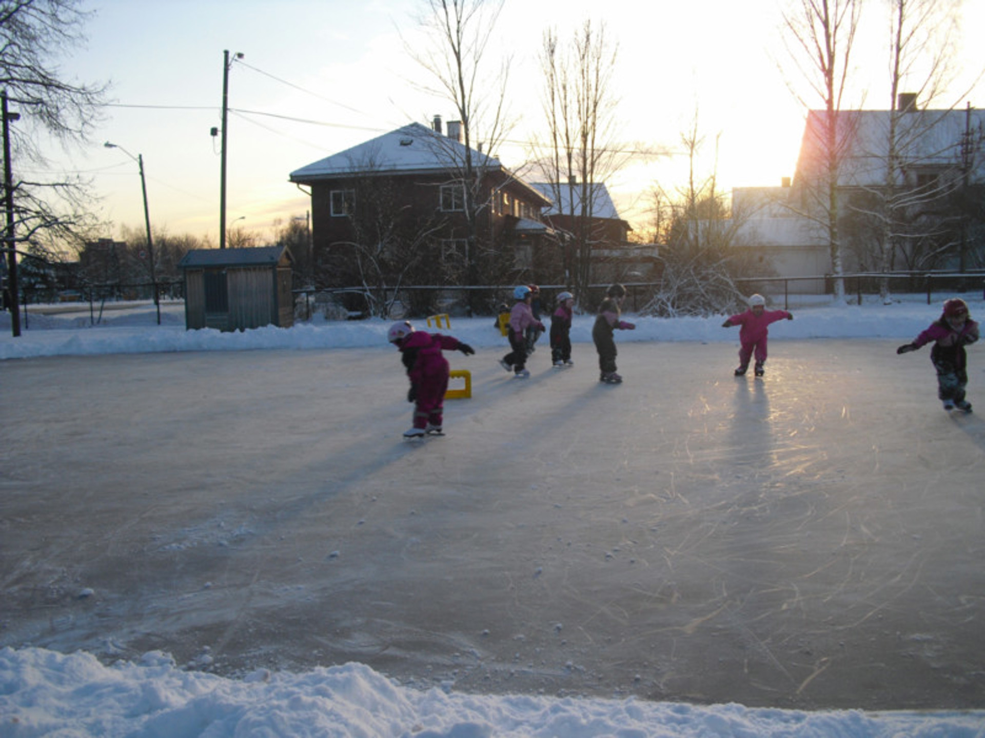 På plassen foran barnehagen sprøytes det skøytebane. Barna blir skikkelig gode skøyteløpere! Mange i nabolaget benytter også banen etter stengetid og i helger.