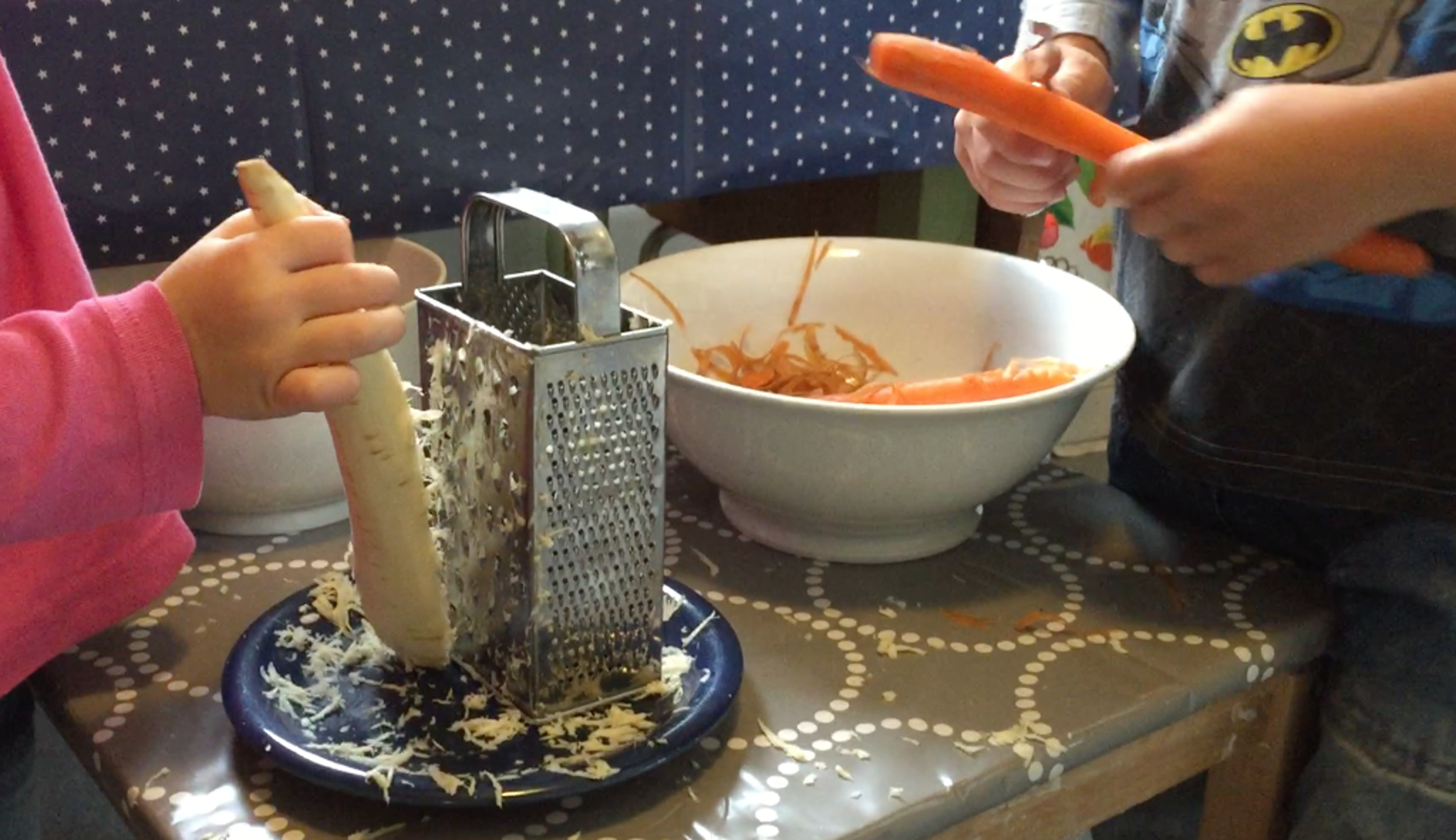 Hver fredag har vi varmmat som vi prøver å lage helt fra bunnen:-)! Kreves det mer tid, starter barna med matlaging allerede tidligere i uken. Alle har mulighet til å være med på å skjære, krydre, røre og ikke minst smake. Så langt vi kan, bruker vi krydder og grønnsaker fra vår egen hage. Hver mandag når bjella ringer setter vi i gang med baking. Noen lager deig, noen lager rundstykker. Hver høst plukker barna rips og solbær og lager deilig hjemmelaget saft. Hvert år pleier vi få en del frukt fra barnas foreldre og besteforeldre som vi lager vårt eget syltetøy av.